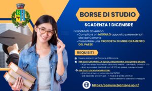 L' Amministrazione Comunale , con Delibera di G.C. n. 44 del 09.10.2025 al fine di valorizzare e sostenere profitto scolastico dei giovani più meritevoli, indice un concorso per l'assegnazione di n. 6 borse di studio anno 2025 per studenti universitari e delle scuole secondarie di 2° grado del Comune di Bianzone.